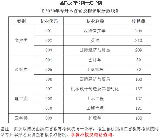 紹興文理學(xué)院元培學(xué)院2020年專(zhuān)升本錄取分?jǐn)?shù)線(xiàn)