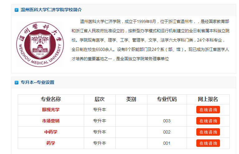 溫州醫科大學仁濟學院統招專升本專業