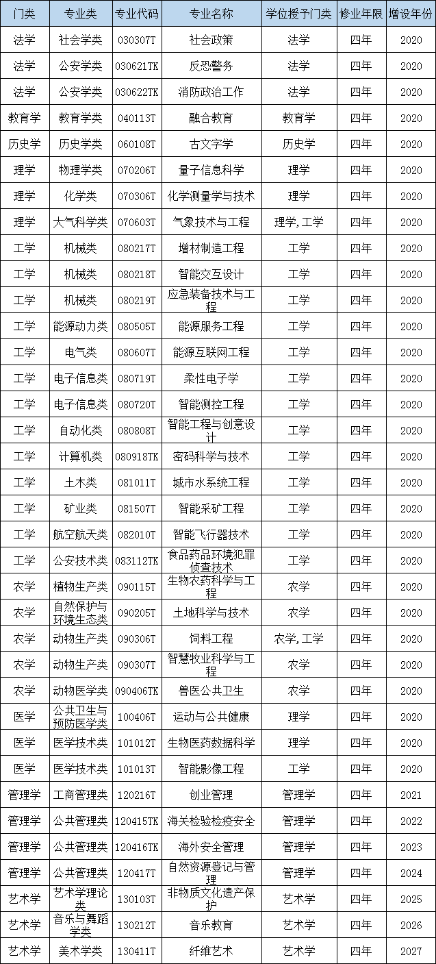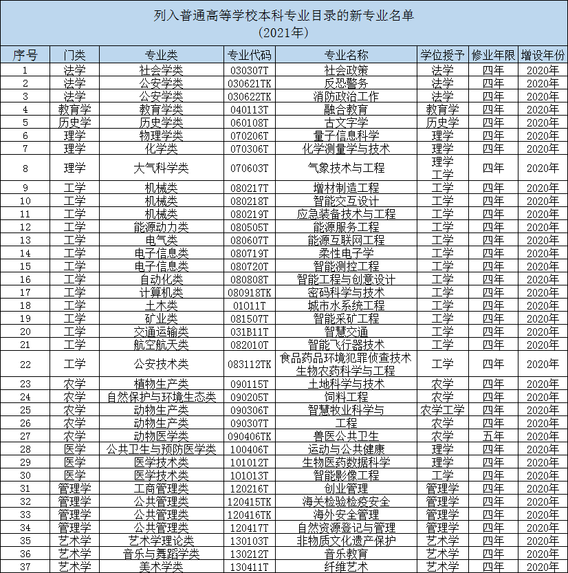 新專業(yè)名單(2021年)