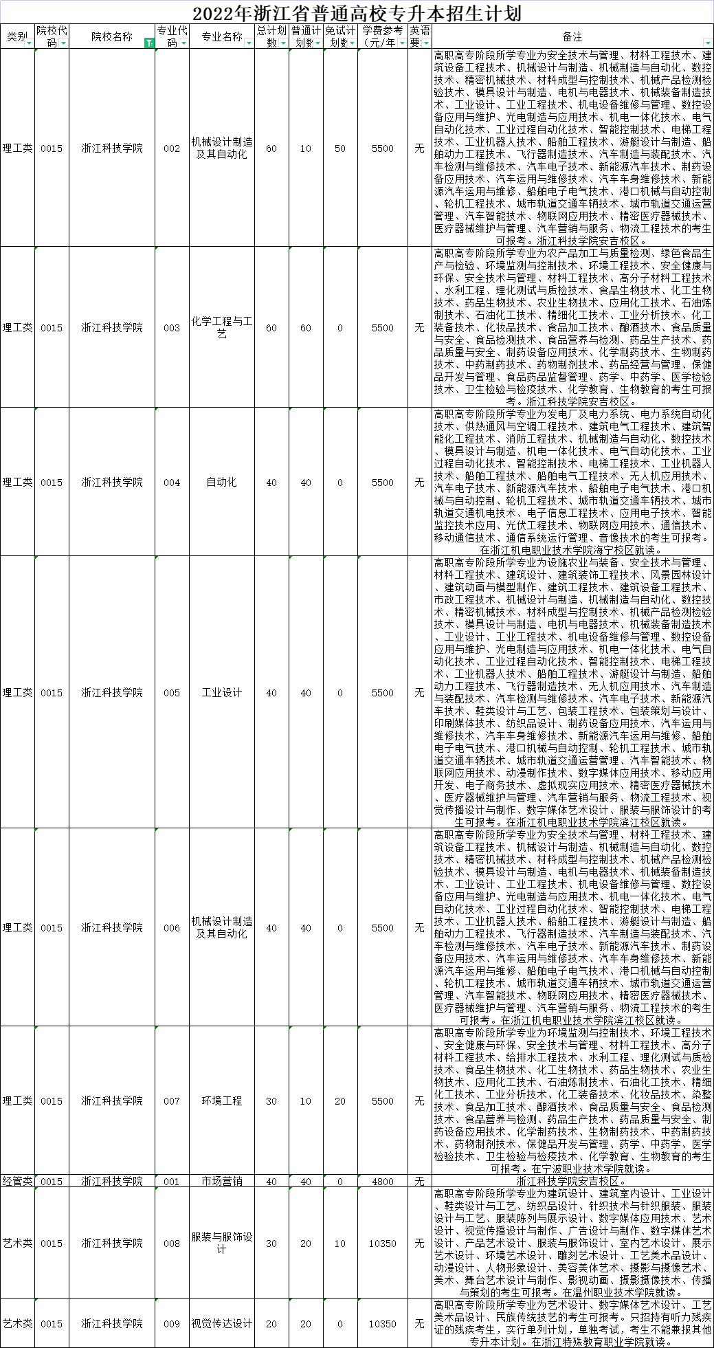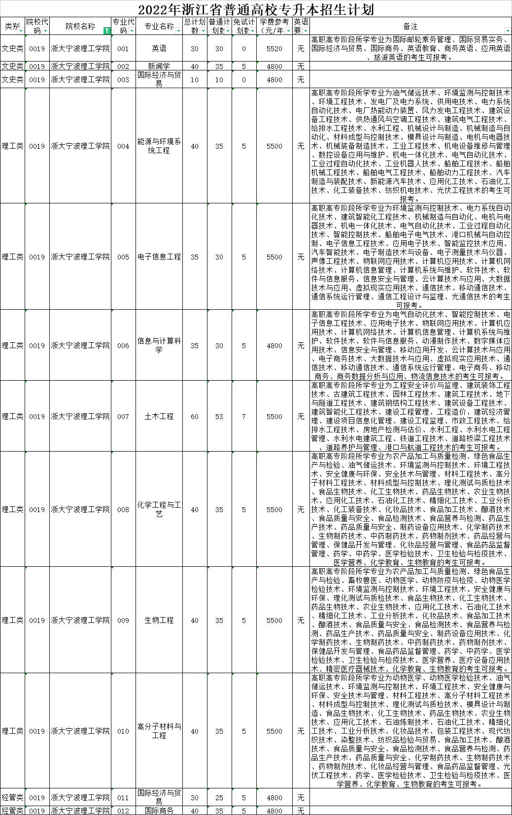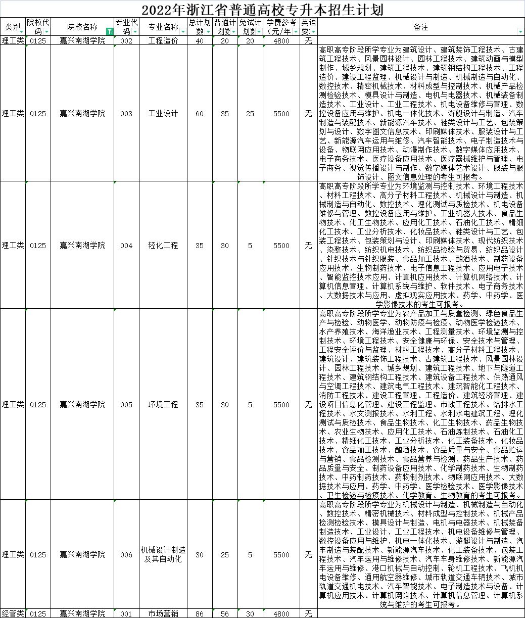 | 理工類 | 0020 | 杭州師范大學 | 008 | 環境工程 | 40 | 40 | 0 | 6000 | 無 | 高職高專階段所學專業為設施農業與裝備、農產品加工與質量檢測、綠色食品生產與檢驗、園林技術、工程測量技術、環境監測與控制技術、環境工程技術、安全健康與環保、安全技術與管理、工程安全評價與監理、材料工程技術、高分子材料工程技術、風景園林設計、園林工程技術、建筑工程技術、建筑設備工程技術、供熱通風與空調工程技術、建筑電氣工程技術、建筑智能化工程技術、消防工程技術、建設工程管理、工程造價、市政工程技術、給排水工程技術、水文測報技術、水利工程、水利水電建筑工程、理化測試與質檢技術、工業工程技術、化工生物技術、藥品生物技術、應用化工技術、石油化工技術、精細化工技術、工業分析技術、化工裝備技術、食品檢測技術、化學制藥技術、道路橋梁工程技術、化學教育的考生可報考。下沙校區就讀。 |