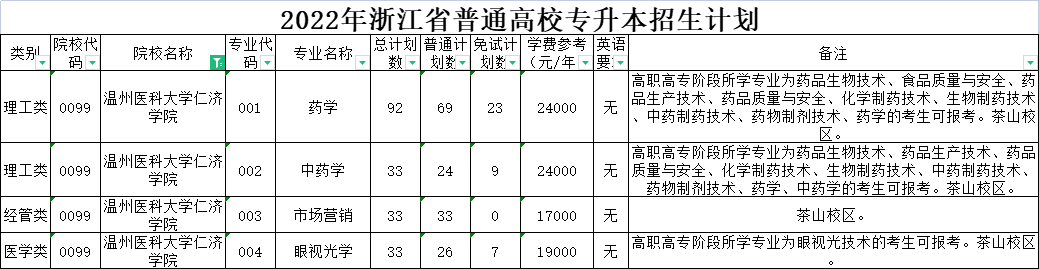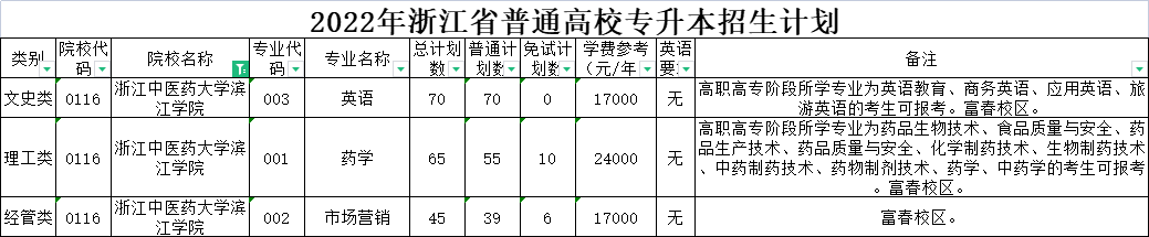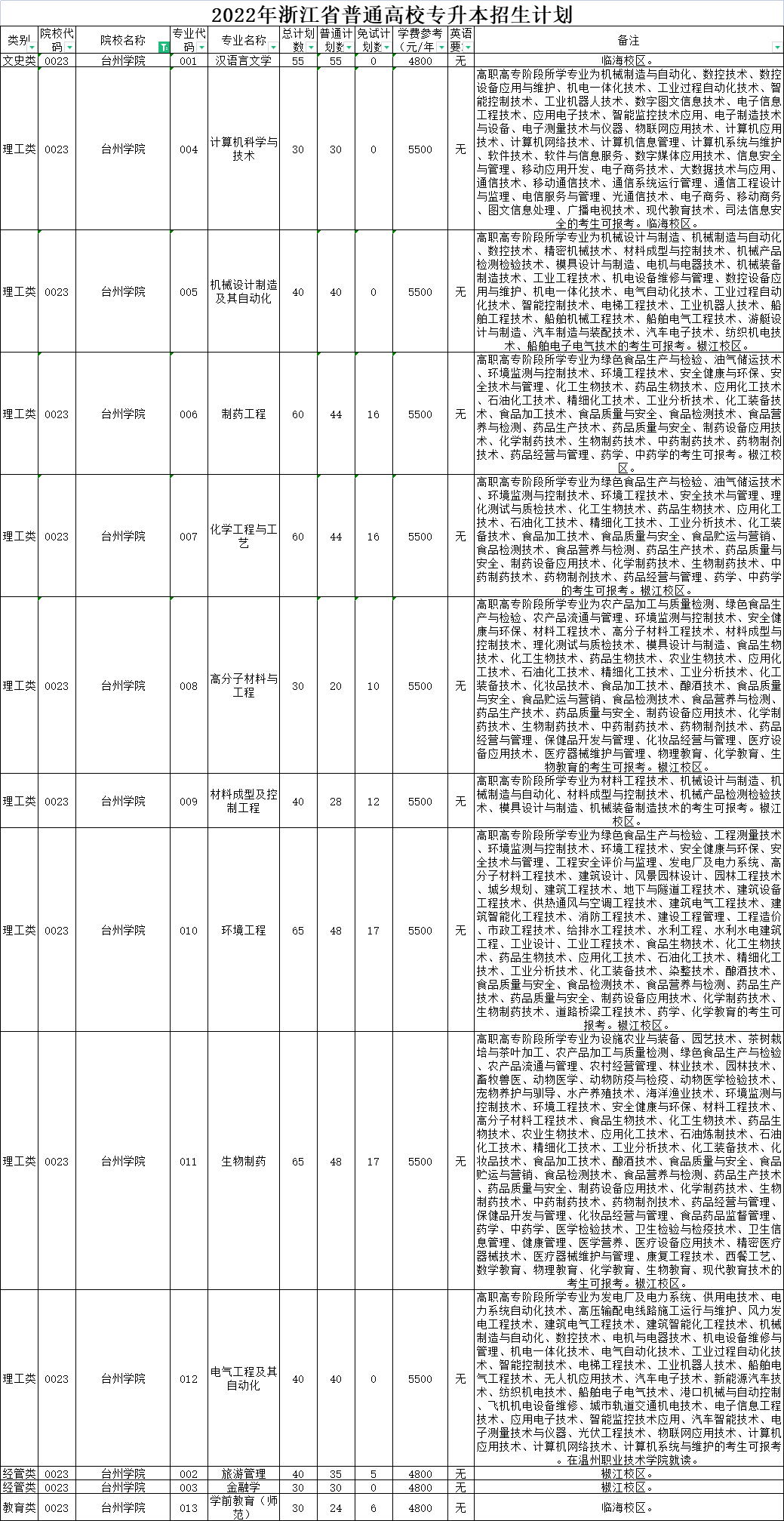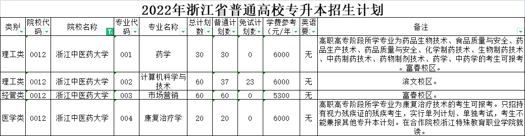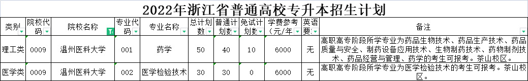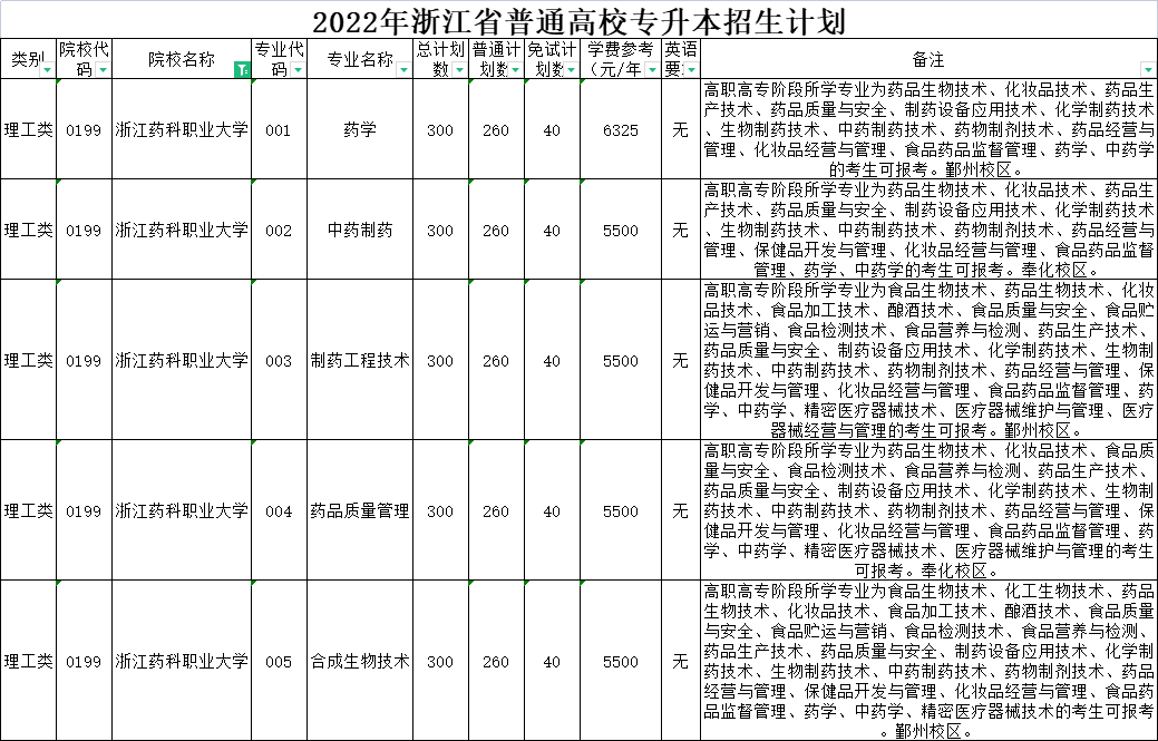 | 理工類 | 0036 | 杭州醫學院 | 006 | 藥學 | 120 | 120 | 0 | 5500 | 無 | 高職高專階段所學專業為藥學的考生可報考。 |