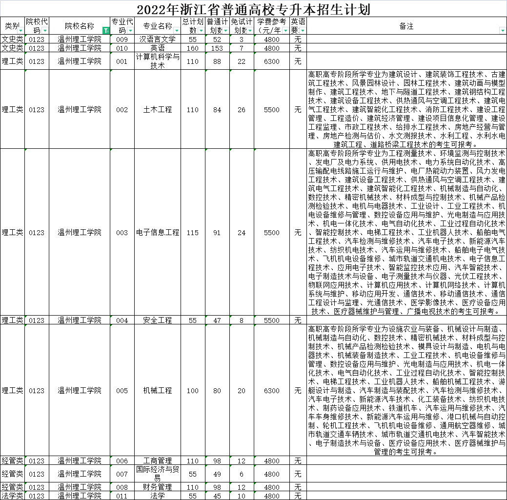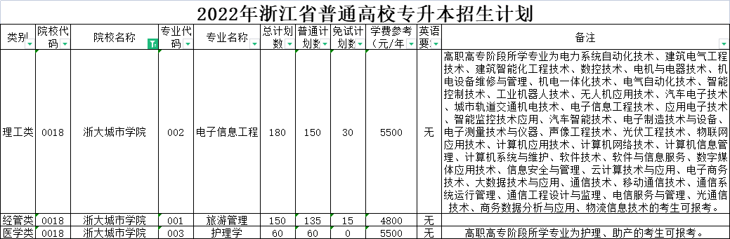 | 理工類 | 0006 | 杭州電子科技大學 | 005 | 電氣工程及其自動化 | 75 | 60 | 15 | 6000 | 無 | 高職高專階段所學專業為發電廠及電力系統、供用電技術、電力系統自動化技術、高壓輸配電線路施工運行與維護、電廠熱能動力裝置、風力發電工程技術、建筑電氣工程技術、建筑智能化工程技術、電機與電器技術、機電設備維修與管理、光電制造與應用技術、機電一體化技術、電氣自動化技術、工業過程自動化技術、智能控制技術、工業機器人技術、船舶電氣工程技術、船舶電子電氣技術、電子信息工程技術、應用電子技術、電子制造技術與設備、電子測量技術與儀器、光伏工程技術、物聯網應用技術的考生可報考。在金華職業技術學院校本部就讀。 |