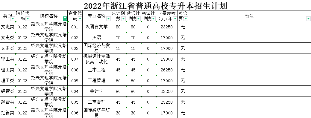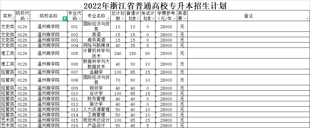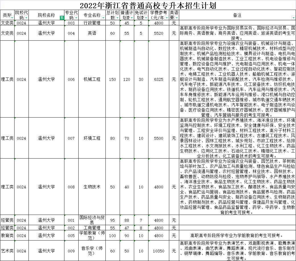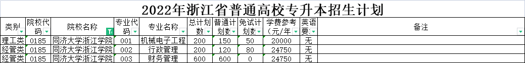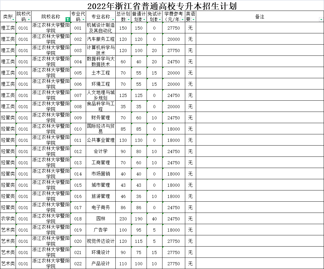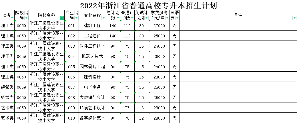 | 類別 | 院校代碼 | 院校名稱 | 專業代碼 | 專業名稱 | 總計劃數 | 普通計劃數 | 免試計劃數 | 學費參考(元/年) | 英語要求 | 備注 |