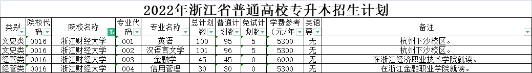 | 經管類 | 0020 | 杭州師范大學 | 006 | 經濟學 | 90 | 90 | 0 | 5300 | 無 | 高職高專階段所學專業為金融管理、國際金融、證券與期貨、保險、投資與理財、互聯網金融、國際經濟與貿易的考生可報考。下沙校區就讀。 |