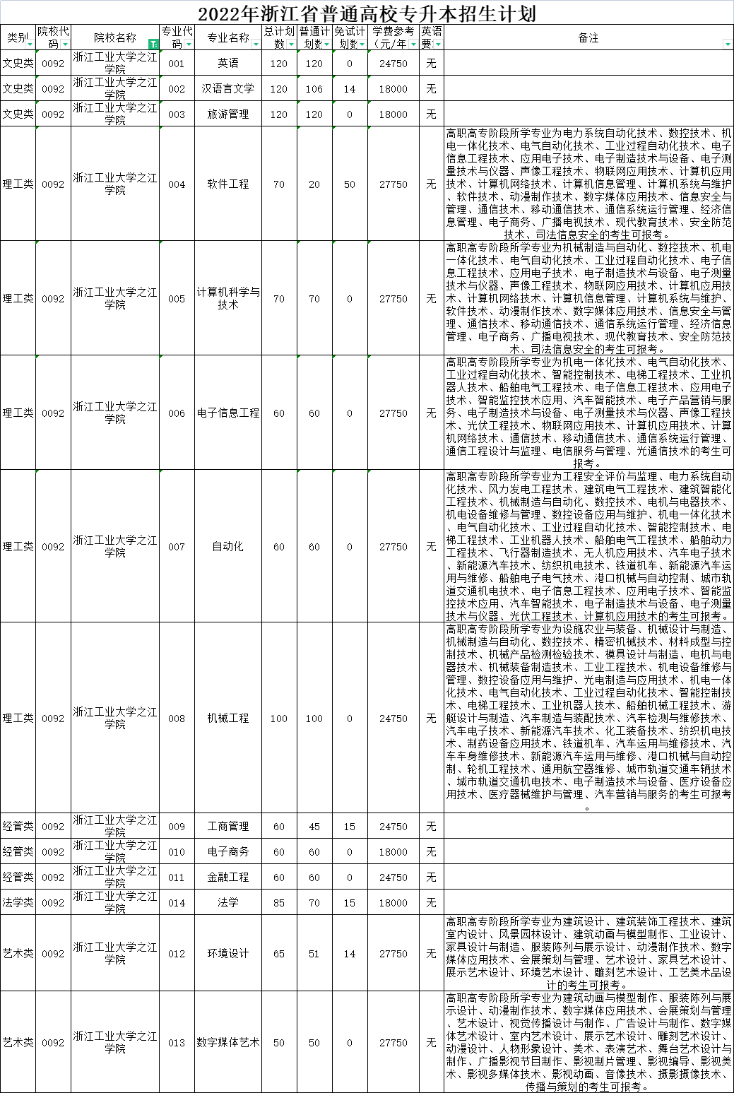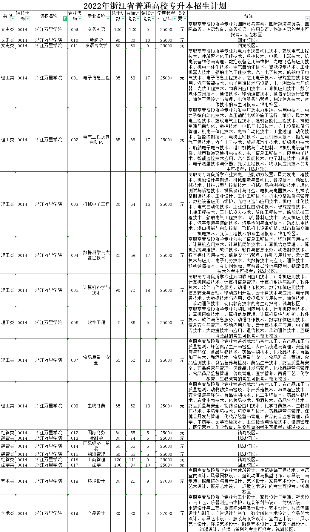 | 理工類 | 0006 | 杭州電子科技大學 | 006 | 軟件工程 | 45 | 45 | 0 | 6900 | 無 | 高職高專階段所學專業為電子信息工程技術、物聯網應用技術、計算機應用技術、計算機網絡技術、計算機信息管理、計算機系統與維護、軟件技術、軟件與信息服務、移動應用開發、云計算技術與應用、電子商務技術、電子商務、移動商務、商務數據分析與應用的考生可報考。在浙江商業職業技術學院就讀。 |