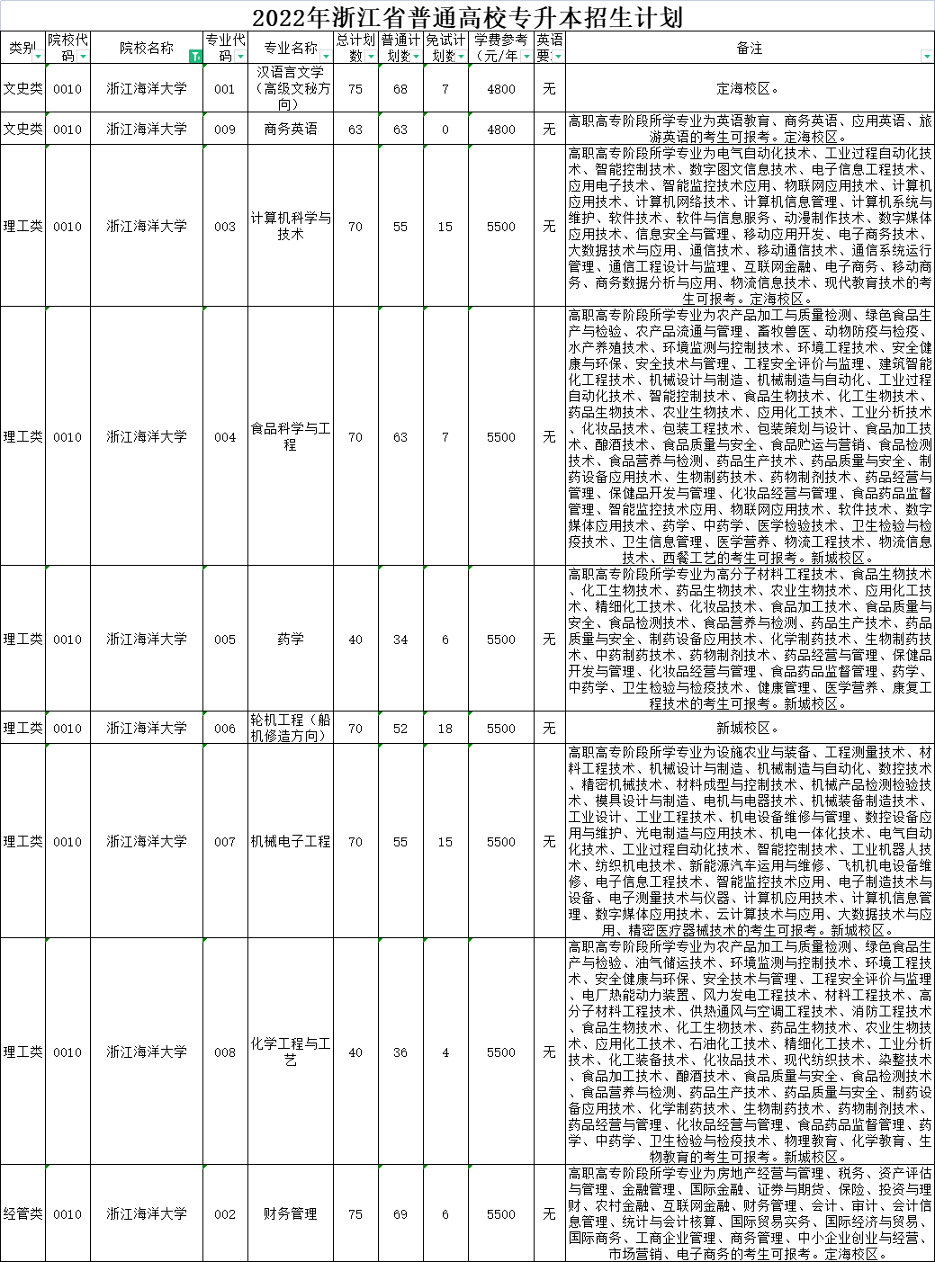 | 文史類 | 0020 | 杭州師范大學 | 003 | 旅游管理 | 180 | 180 | 0 | 5300 | 無 | 高職高專階段所學專業為物業管理、國際郵輪乘務管理、空中乘務、國際商務、工商企業管理、商務管理、市場營銷、跨境電子商務、采購與供應管理、旅游管理、導游、旅行社經營管理、景區開發與管理、酒店管理、休閑服務與管理、餐飲管理、烹調工藝與營養、會展策劃與管理、文化創意與策劃、文化市場經營管理、公共文化服務與管理、文物修復與保護、網絡新聞與傳播、新聞采編與制作、傳播與策劃、媒體營銷、英語教育、商務英語、應用英語、旅游英語、文秘、社會工作、人力資源管理的考生可報考。下沙校區就讀。 |