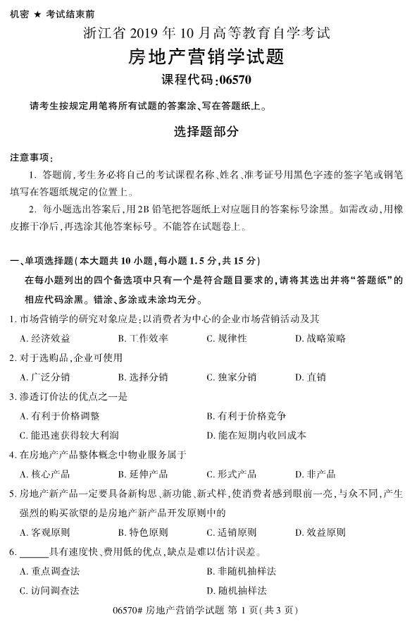 2019年10月浙江自考06570房地產營銷學試題