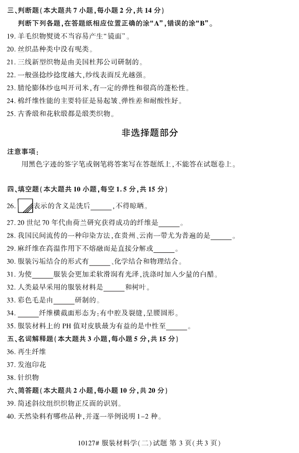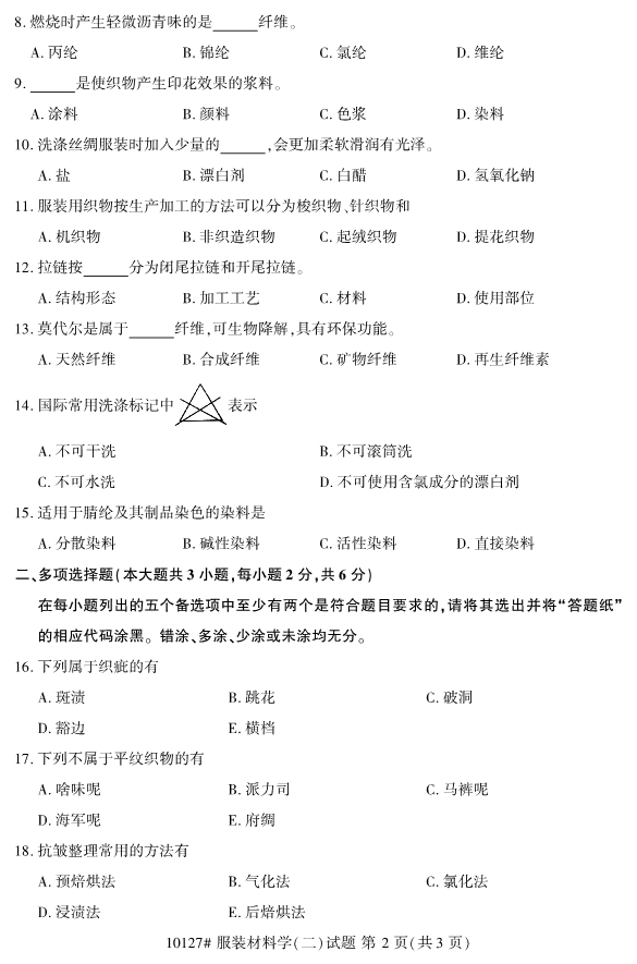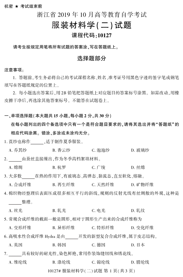 對于考生們來說,現階段就開始進行浙江自考的復習備考的話,考生們能夠留給自己復習備考的空間越大。同時,考生們可以通過真題的訓練來檢驗自己的學習成果。為了幫助考生們復習備考,浙江專升本整理了2019年10月浙江自考10127服裝材料學(二)試題。