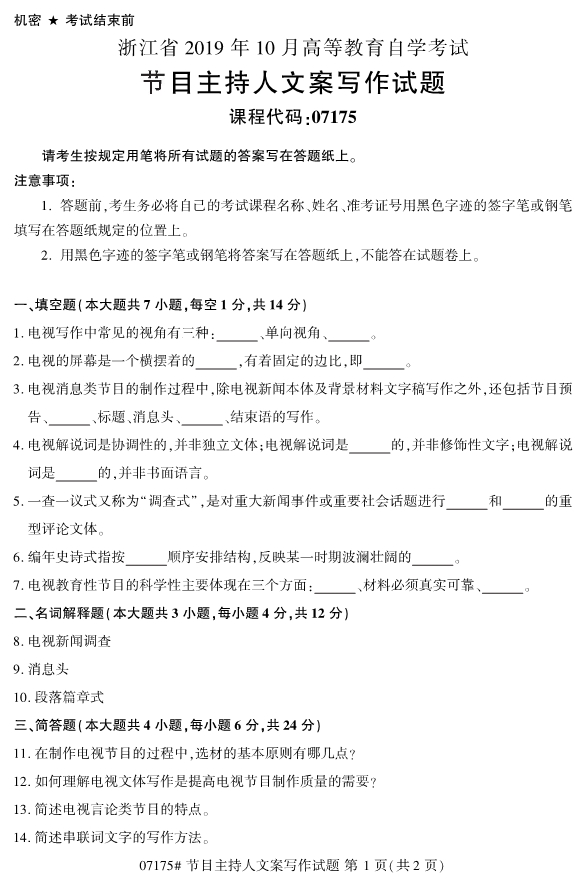 根據往年的經驗,2020年4月份的浙江自考專升本考試的報名工作將于2020年1月啟動。考生們復習備考的工作也要開始進行了。在備考過程中,真題訓練是必不可少的一環。為了幫助考生們備考,小編整理了2019年10月浙江自考07175節目主持人文案寫作試題。
