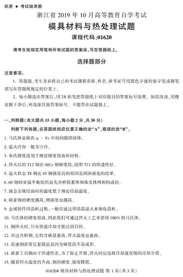 【結尾】以上就是關于2019年10月浙江自考專升本01620模具材料與熱處理試題的全部內容,考生如果想獲得更多關于浙江專升本相關資訊,如浙江專升本政策公告、統招專升本、成考專升本、自考專升本、網教專升本、專升本常見問題等相關信息,敬請關注我們浙江專升本網(http://www.205760.com/)。