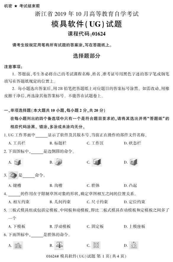 對于考生們來說,雖然還有4個月才會迎來2020年4月份的浙江自考,但是這中間真正留給考生們復習備考的時間其實不是很多。所以,考生們如果想要盡早通過浙江成人自考拿到自考本科畢業證,必須要盡早開始復習備考工作。為了幫助考生們復習備考,小編整理了2019年10月浙江自考專升本01624模具軟件(UG)試題。