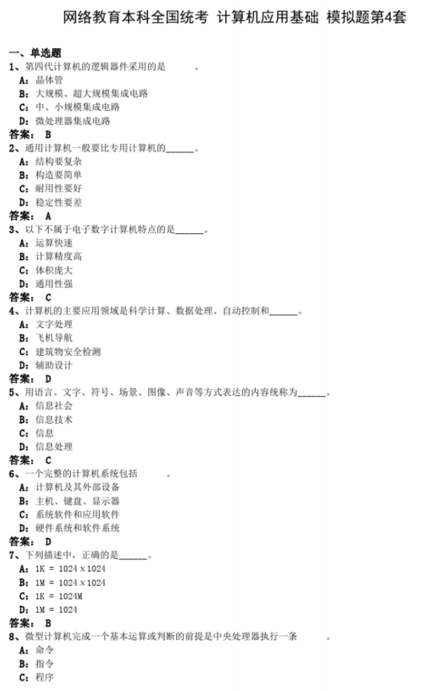網絡教育本科全國統考《計算機應用基礎》模擬題4