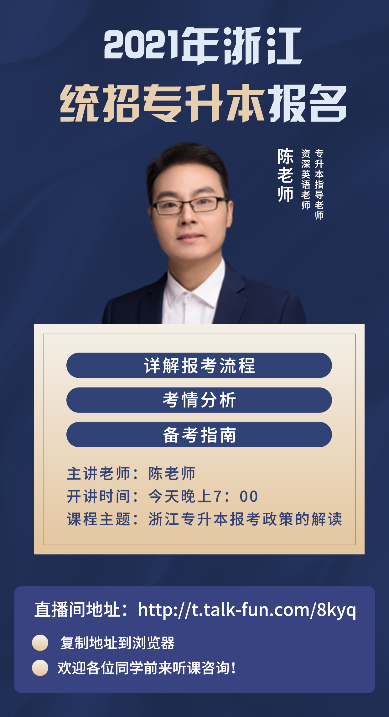 今天晚上7:00,我們將請專升本指導老師陳老師在直播間給我們帶來浙江專升本報考政策的解讀,給大家詳解報考流程,考情分析,備考指南!歡迎大家按時進入直播間觀看!