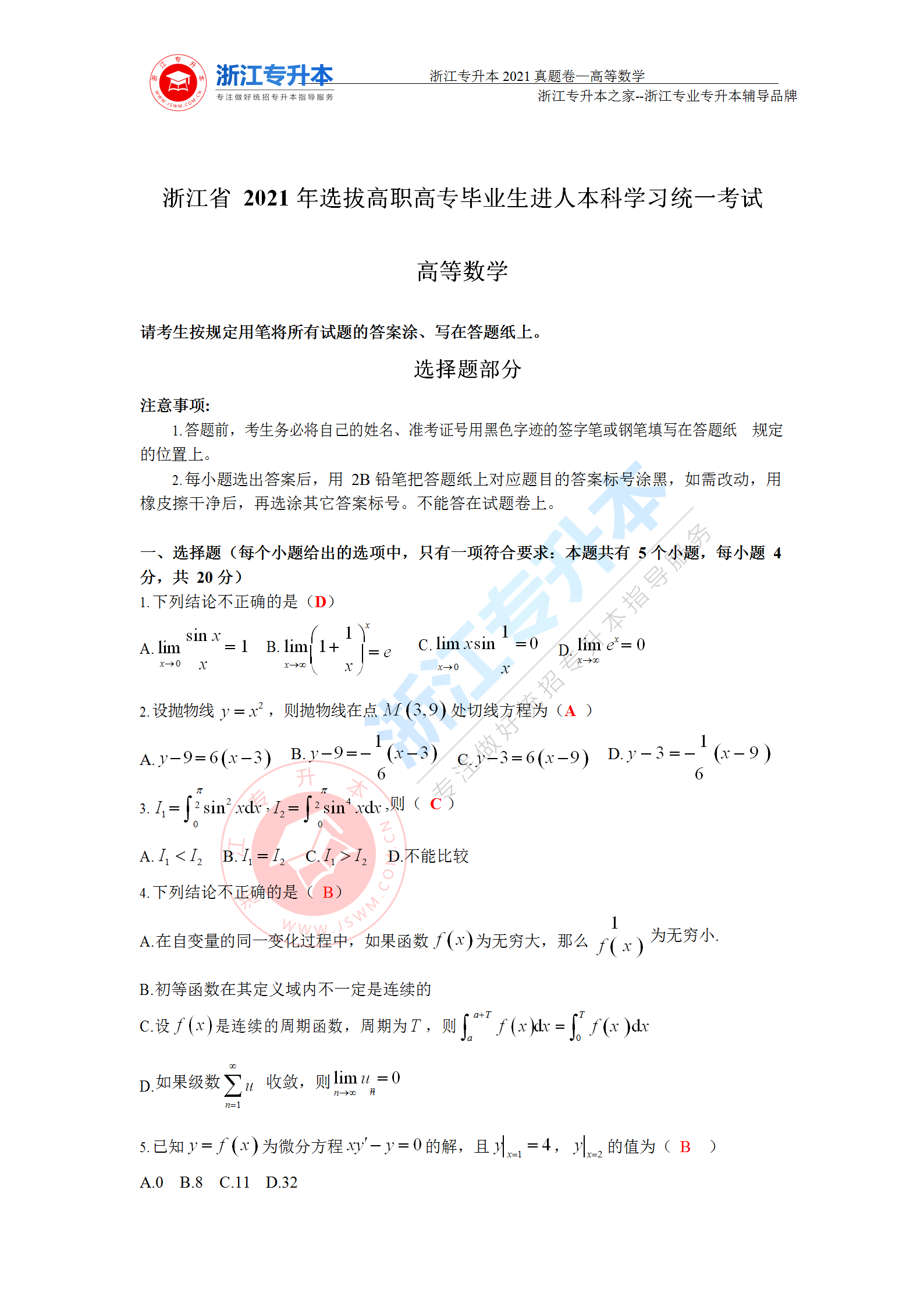 2021年浙江專升本高等數學真題答案